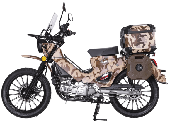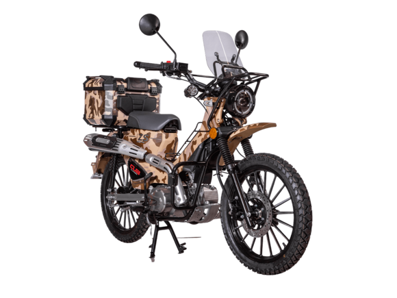 ATAKI Yemi Hunter – стильный мопед для настоящих охотников и рыбаков. Юркая модель с камуфляжным принтом и объёмными кофрами, готовая отправиться на лесные тропы.Силовая установка представлена одноцилиндровым 4-тактным двигателем с воздушным охлаждением. При объёме 120 см³ двигатель способен обеспечить мощность в 8,8 л.с. Бесперебойную работу в любых условиях обеспечивает карбюраторная система подачи топлива. Запуск двигателя осуществляется с помощью электростартера или кикстартера. Полуавтоматическая коробка передач имеет 4 ступени.Максимальная скорость 80 км/ч.Объём топливного бака 4,5 литра.На мопед установлены колёса диаметром 17 дюймов. Передняя подвеска – классическая телескопическая вилка, подвеска сзади – 2 гидравлических амортизатора. На оба колеса установлены гидравлические дисковые тормоза.Вес 102 кг. Колёсная база 1245 мм. Высота по седлу 765 мм.