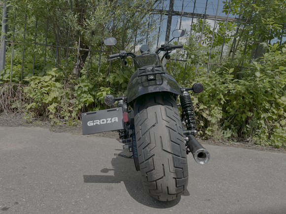 GROZA Toughman 800 – суровый и брутальный круизёр, который сразу обращает на себя внимание в потоке своей схожестью с кастом-байком: спартанской простотой с монохромной гаммой, олдскульными элементами, изящно оформленным двигателем, великолепной выхлопной системой и широченной задней покрышкой.Двухцилиндровый V-образный двигатель объёмом 800 см3 мощностью 61 л.с. при высоких показателях динамики и отличном крутящем моменте способен разгонять аппарат до 160 км/ч. Инжекторный впрыск топлива с инжектором DELPHI увеличивает топливную экономичность, а также позволяет добиться высокой приёмистости и неприхотливости агрегата. Привод на ведущее колесо осуществляется ремнём знаменитой марки USA Gates. Жидкостная система охлаждения не допустит перегрева мотора даже при самом агрессивном вождении.Аппарат имеет 6-ступенчатую механическую коробку передач с классической схемой “1-N-2-3-4-5-6”. На мотоцикл установлены литые алюминиевые диски диаметром 19 дюймов спереди и 17 дюймов сзади. Ширина передней покрышки – 130 мм, задней – целых 240 мм! С неровностями дороги эффективно справляются телескопическая вилка спереди и маятник с двумя газонаполненными амортизаторами сзади. Эффективное и безопасное замедление с любых скоростей обеспечивают гидравлические дисковые тормоза спереди и сзади.Байк обладает внушительным дорожным просветом 160 мм, что позволяет, при желании, съезжать на дороги с худшим покрытием, нежели асфальт. Зеркала не выходят за габариты руля, что позволяет комфортно проезжать на нём в междурядье.Мотоцикл сочетает в себе отличные технические характеристики, комфорт и надёжность, что позволяет вам ощутить настоящую свободу на любой дороге.