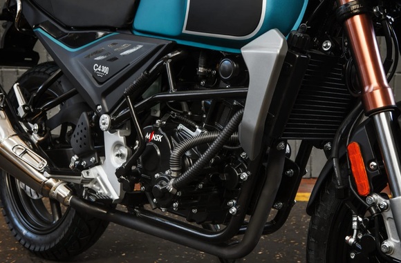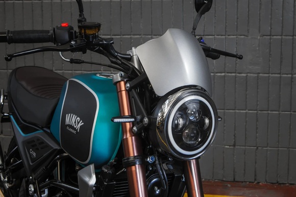 Мотоцикл Minsk C4 300 – новый стильный классический дорожный мотоцикл, пришедший на смену модели С4 250. Он обладает всеми чертами мощного городского байка, необходимыми для комфортного передвижения как по городу, так и по шоссе. С4 300 оснащен надежным бензиновым двигателем с воздушно-масляным охлаждением. Его рабочий объем — 282,7 кубических сантиметров, мощность 28,5 л.с. На сегодняшний день — это самый мощный мотоцикл в линейке мотоциклов MINSK. Максимальная скорость — более 130 км/ч. Этого вполне хватит для ощущения скорости и уверенности на дороге. Объем бака -18 литров, что позволит передвигаться на значительные расстояния без дозаправки. Двигатель встроен в стальную дуплексную раму. На С4 300 установлена телескопическая вилка перевернутого типа с большим диаметром перьев и увеличенным ходом. Задняя подвеска — стальной маятник и моноамортизатор с регулировкой жесткости. MINSK С4 300 оборудован полным комплектом LED-светотехники. Фара, скомпонованная из большого количества LED-элементов, не только хорошо светит, но и эффектно смотрится.Благодаря доступной цене и простоте управления, можно смело сказать, что это прекрасный выбор, как для начинающих, так и для опытных мотолюбителей.