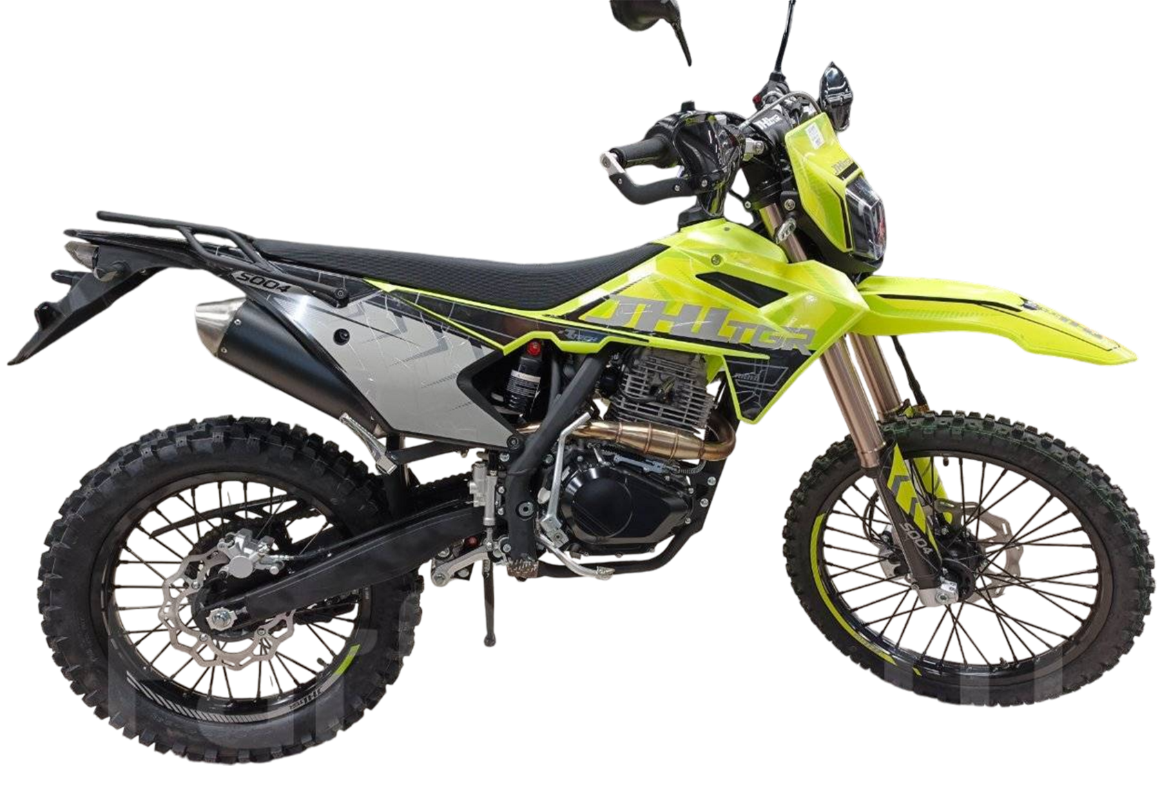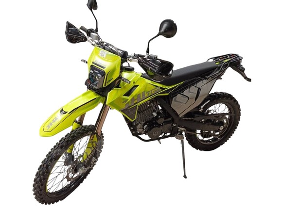 Мотоцикл JHL S004 300 (4T 175FMM) ПТС – отличный снаряд для внедорожного экстрима, представляющий собой оптимальный баланс производительности и технической оснащённости, поэтому он идеально подходит как новичкам, так и опытным райдерам. Удобный, простой и надёжный мотоцикл, который полностью оправдывает свою цену.Мотоцикл оснащён одноцилиндровым 4-тактным двигателем воздушного охлаждения (ZONGSHEN PR300/ZS175FMM-5) объёмом 271 см3, который обеспечивает мощность в 24 л.с, что позволяет развивать большую скорость и с лёгкостью преодолевать трассы со сложным рельефом. Карбюратор NIBBI PE30 обеспечивает бесперебойную работу техники в самых жёстких условиях эксплуатации, простоту и лёгкость в обслуживании, а также неприхотливость к качеству топлива. Двигатель работает в паре с 5-ступенчатой механической коробкой передач с классической схемой “1-N-2-3-4-5”.Передняя подвеска — телескопическая вилка перевёрнутого типа длиной 830 мм, регулируемая на отбой, задняя — регулируемый моноамортизатор 450 мм. Мотоцикл оснащён классическими спицованными колёсами диаметром 18 и 21 дюйм. Эффективное и безопасное замедление с любых скоростей обеспечивают гидравлические дисковые тормоза.Высококачественная износостойкая резина с развитым протектором отлично держит дорогу на различных типах покрытия и в самых разных поворотах. Благодаря удобным подножкам и сиденью эргономичной формы, покрытому антискользящим материалом, на мотоцикле комфортно ездить вдвоём.Объём топливного бака составляет 10 л, чего с успехом хватает для длительных сессий. Наличие яркой светодиодной фары позволяет кататься в тёмное время суток. JHL S004 300 (4T 175FMM) сочетает в себе отличные технические характеристики, комфорт и надёжность, что позволяет вам ощутить настоящую свободу на любой трассе.