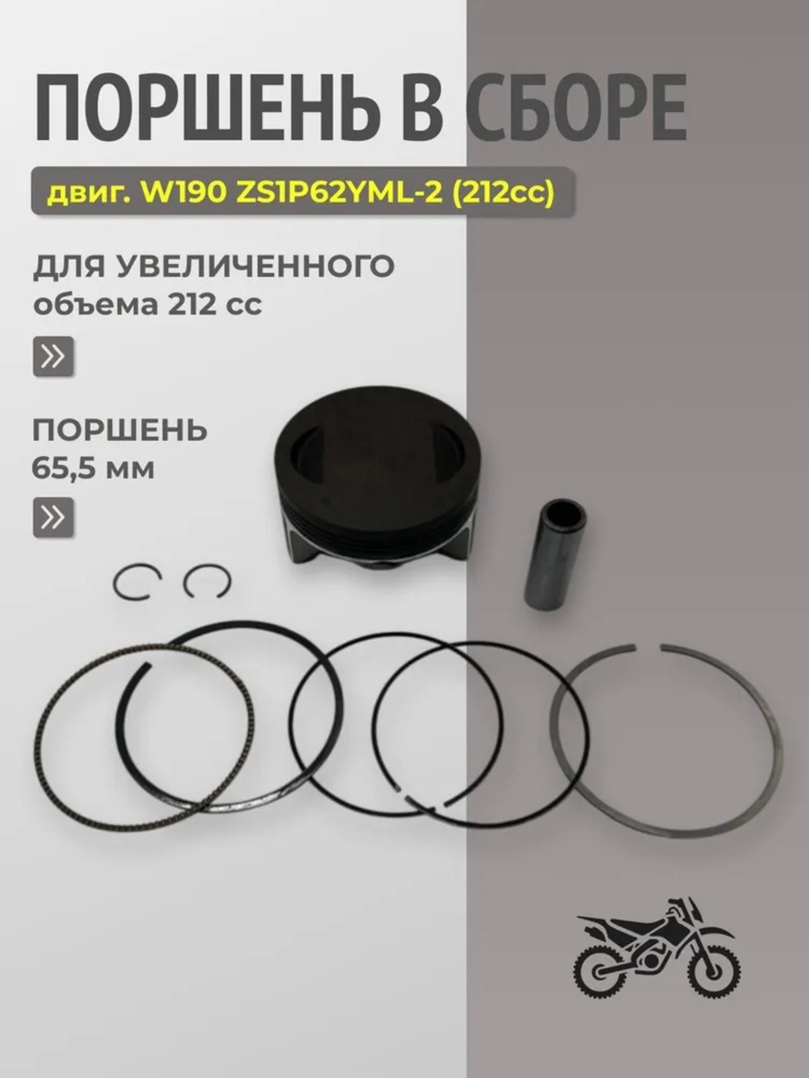 Поршень диаметром 65мм для тюнинга двигателя ZS190. Предназначен для установки в комплекте с расточенным цилиндром или из "кита 212сс" для увеличения рабочего объема до 212cc. В комплекте: поршень, кольца, стопорные кольца, поршневой палец.